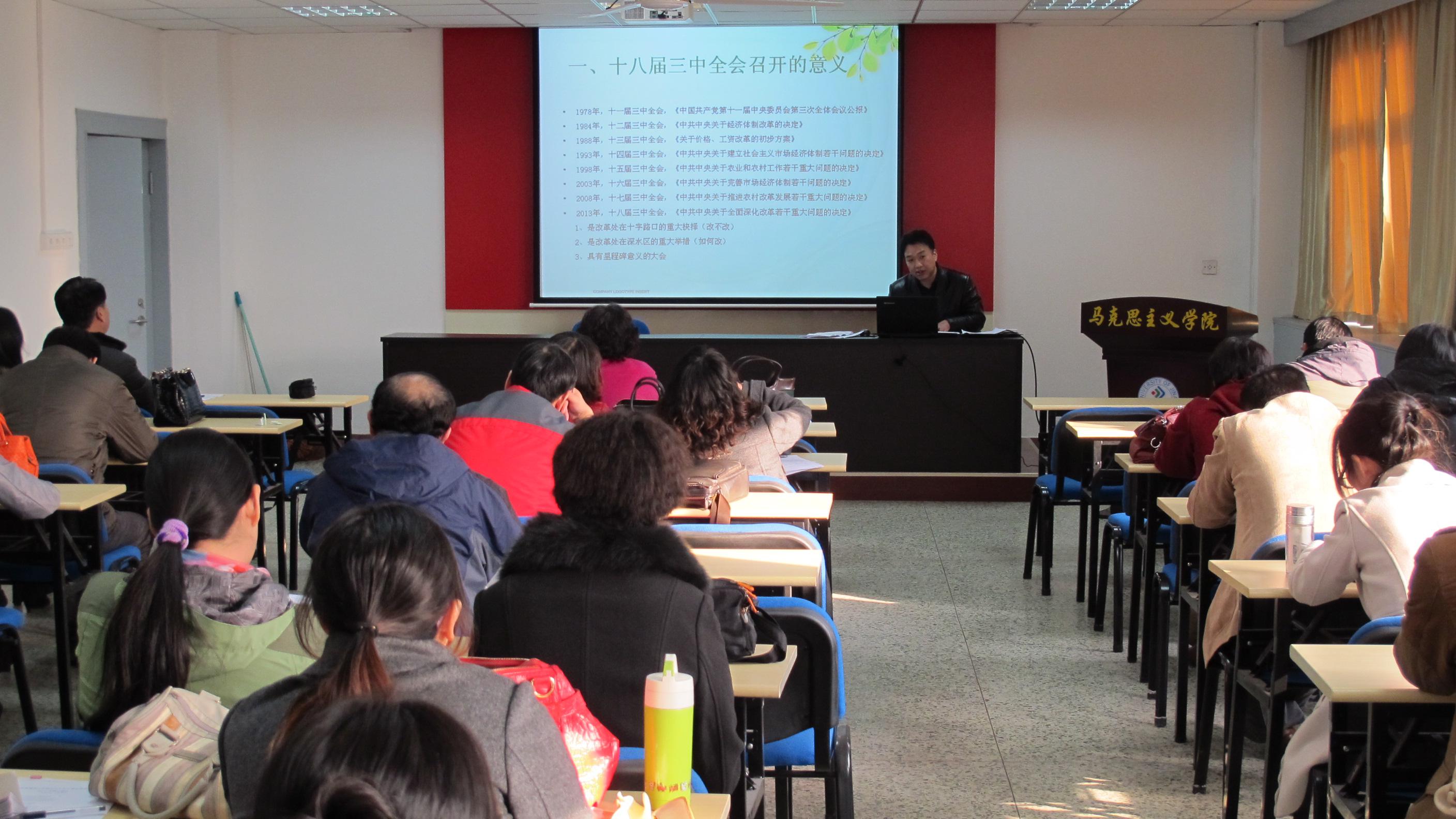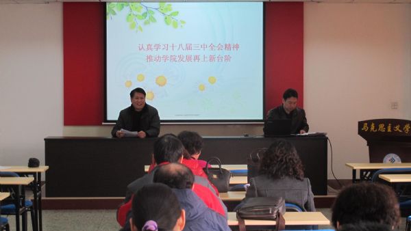 于2013年11月26日下午在学院会议室集体学习十八届三中全会精神。学院党委书记张兵亭主持会议,学院院长文洪朝教授主讲,学院全体教职员工参加了学习。